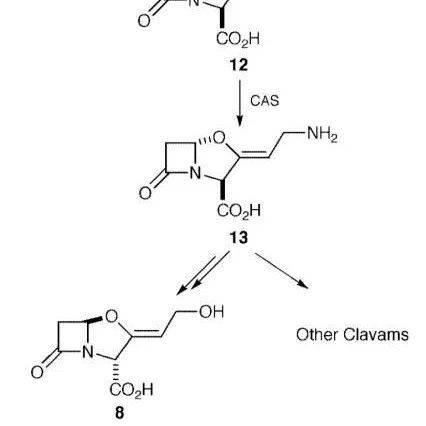 图1. 克拉维酸生物合成途径(8:产物克拉维酸)