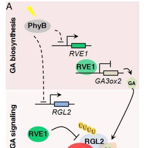 DELLA蛋白是GA信号转导的负调控因子。林荣呈研究组最新研究发现,在蛋白水平上,RVE1通过与E3泛素化连接酶SLY1(SLEEPY1)竞争结合DELLA蛋白RGL2进而抑制RGL2发生泛素化降解。在转录水平上,RVE1和RGL2协同调控下游靶基因的表达;RGL2能够增强RVE1的转录活性以及与下游基因启动子的结合强度。phyB通过抑制RVE1和RGL2的转录而调控种子的休眠和萌发。该研究不仅阐释了DELLA蛋白被一个转录因子直接稳定的作用模式,而且发现DELLA蛋白可以增强转录因子的转录活性,为研究DELLA蛋白的作用机制和作用方式增加新的认识。同时,该研究揭示了phyB-RVE1-RGL2模块通过整合光信号、GA合成以及GA信号通路调控种子休眠和萌发的新机制,将为培育更好适应环境和农业生产的作物新品种提供理论支持。