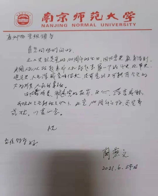 从6月初开始, 92岁高龄的陶燕文已经开始筹备,要参加省科协庆祝中国共产党成立100周年“七一”表彰大会,并亲手向党组织缴纳自己的“大额党费”。但6月10日,她在家中不慎摔伤,随即被送往医院,由于高龄外加心脏房颤,非常危险。“还好,经过医生的全力抢救,母亲被救回来了。”从ICU转入普通病房后,陶燕文只能平躺,无法坐立,说话也微弱无力,但即使这样,她依然记得自己为党庆生的心愿。“她跟我说,让我准备纸和笔,说自己现在虽然人去不了了,但心意一定要到,为了表达对党组织的尊重,她希望能写信说明,表达对党的感激。”