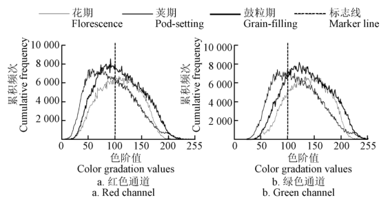研究证实了大豆冠层数码图像的光学三原色RGB模型色阶遵循偏态分布,并利用偏态分析得到5类共20个叶色偏态参数。花期、荚期和鼓粒期的冠层叶色偏态参数普遍存在明显差异,其中表征叶色深浅的均值、中位数、众数从花期至鼓粒期呈现先降后升的变化趋势,而表征叶色偏向性的偏度和表征叶色集中度的峰度则普遍呈现相反的变化趋势。