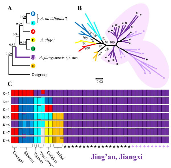图2.遗传分析。A.基于线粒体基因COI的简化系统发育树(修改自Yan et al., 2018),其中U2进化支代表江西大鲵单倍型,D进化支代表华南大鲵单倍型,中国大鲵所在进化支尚不确定;B.基于简化基因组SNPs位点构建的最大似然树,淡紫色背景代表U2进化支(江西大鲵);C.基于简化基因组SNPs位点遗传组分混合分析 (K=2-8, 最适 K=7)。星号(*)表示来自大杞山的18个野外个体,包括成体,亚成体以及幼体;淡紫色菱形(◇)表示来源养殖场的个体。