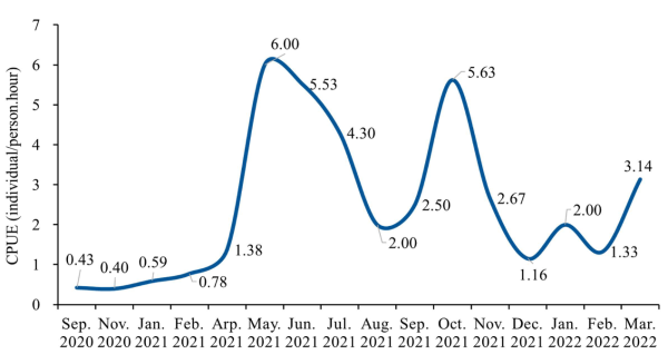 图3.野外调查目击频率。单位每人每小时大鲵目击数量(CPUE)变化图,自2020年9月至2022年3月,每人每小时目击大鲵成体和亚成体个体数量变化。