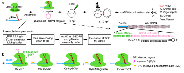 图1.在斑马鱼胚胎中建立CRISPR-dCas13系统的策略