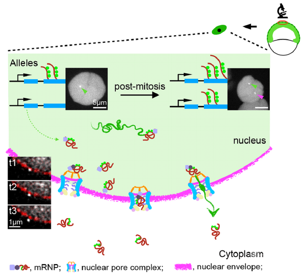利用优化的CRISPR-dCas13系统,结合活体实时成像,在斑马鱼胚胎合子基因组启动后追踪eppk1和100537515基因的从头起始转录,研究发现等位基因间转录的高度异质性。相比等位基因间的从头起始转录,在有丝分裂后等位基因间的转录再激活趋于同步(图2),且观察到转录记忆的特征。由于转录的波动性受到内源噪音和外源噪音的调控,等位基因间转录的相关性在细胞分裂后明显增强,表明转录再激活受到外源噪音的主导,并暗示转录记忆可能作为潜在的外源噪音调控高度异质性的从头起始转录向同质化的转录再激活转变。此外,利用该系统追踪转录后mRNP的运动,研究发现CRISPR-dCas13标记的内源mRNP运动主要存在受限运动和自由扩散两种形式。在追踪mRNP出核过程中(图2),CRISPR-dCas13标记的mRNP出核时间表现高度的波动性,mRNP的出核受到限制,在核内发生累积。过表达出核相关因子Alyref和Nxf1可以明显缩短出核mRNP的时间、减少其在核内的累积。