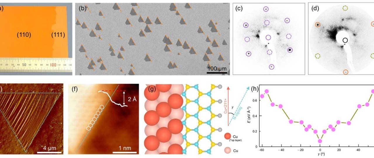 近日,中国科学院大连化学物理研究所催化基础国家重点实验室研究员傅强团队与台积电(TSMC)Lain-Jong Li团队、台湾交通大学Wen-Hao Chang团队、美国莱斯大学B. I. Yakobson团队、北京大学教授张艳峰团队合作,在2英寸晶圆衬底上成功外延生长单晶六方氮化硼(hBN)单层薄膜。