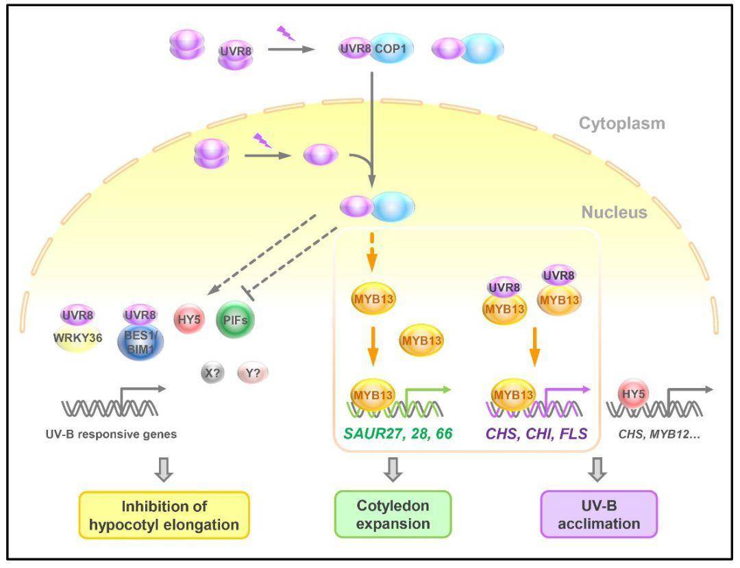 总之,该研究表明,不同的光质(由特定的光受体感知)可以通过下游的COP1-HY5/HYH模块调节生长素诱导的雄蕊伸长和雄性育性。该研究还表明,光通过相似的分子调控模块影响雄蕊和下胚轴伸长。