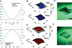 此思路通过设计各个点的局部热变形大小,而非指向矢的空间排布,实现在具有均质指向矢的LCEs的3D形状控制。同时,研究者通过有限元分析和基于高斯几何的理论模型,实现了对给定局部热变形分布的3D形状预测(正问题),以及求解预设3D形状所对应的局部热变形分布(反问题)。