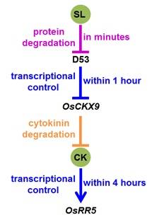 利用外源细胞分裂素处理野生型幼苗进行会导致类似Hsf1突变体的表型,如叶片变小,绒毛丰度增加以及叶片边缘出现 “叉齿”,而用外源细胞分裂素处理Hsf1突变体进一步增强了这种表型,表明该突变对细胞分裂素的敏感性增强,并暗示Hsf1突变体可能通过对细胞分裂素的感知增强,从而改变了叶片的发育。通过进一步的qRT-PCR和RNA原位杂交表明,细胞分裂素信号途径中A型反应调节子ZmRR3在Hsf1的尖端异位表达,尤其是“叉齿”出现的边缘位置。通过研究ZmRR3 无效等位基因(也称为aberrant phyllotaxy1, abph1)与Hsf1基因之间的相互作用,发现ZmRR3抑制了玉米叶片中的细胞分裂素信号传导。