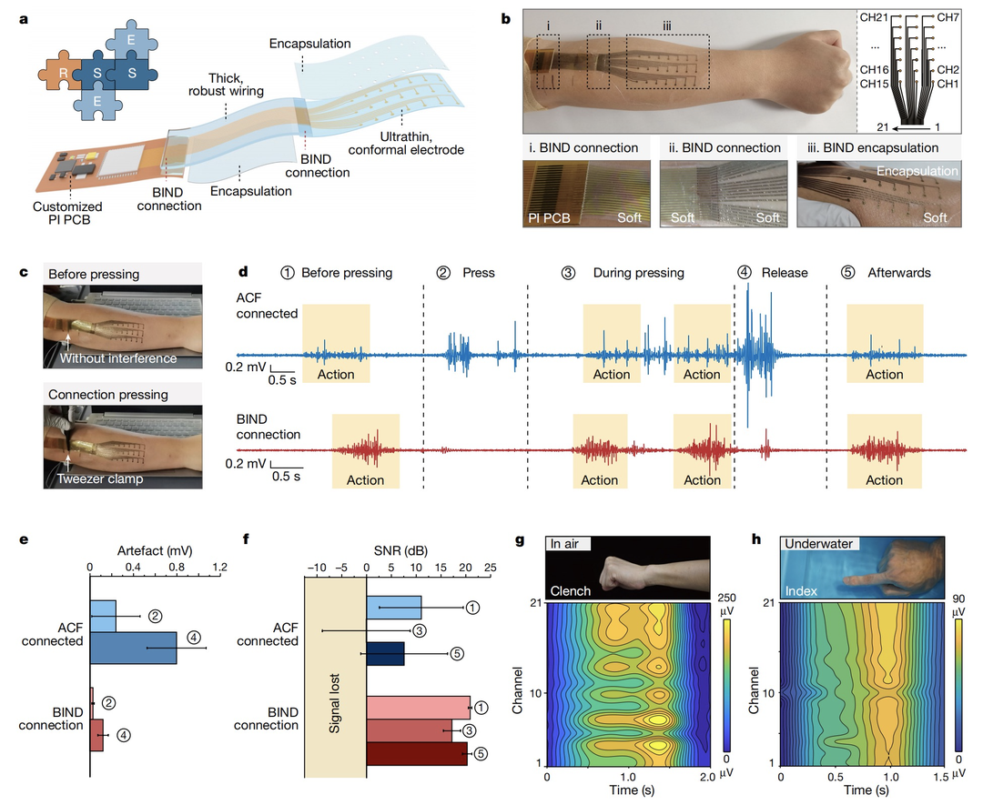 为了制备ACEL器件的透明电极,作者将银纳米线(Ag NWs)沉积在鱼明胶薄膜表面,成功制备了柔性透明导电电极。该电极弯曲500次后的可见光透射率高达82.3%,方阻仍然低至22.4 Ωsq-1,呈现了优良的抗弯曲性能(图3)。将该薄膜电极串联LED灯泡后发现,把薄膜电极弯曲成不同程度时LED灯泡仍然持续发光,显示薄膜电极具有极好的导电特性,将其用于ACEL器件可以确保稳定的电信号输出。
