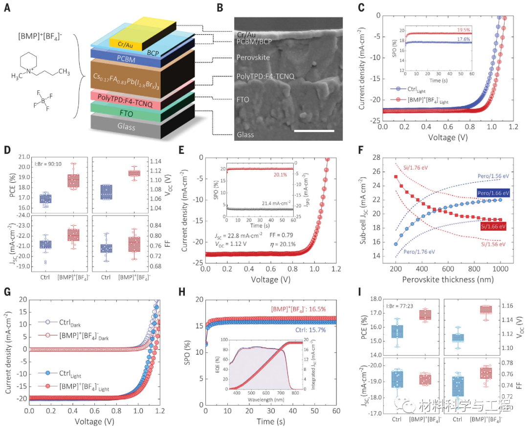 经优化后的单节Sn-Pb钙钛矿电池获得了19.4%的光电转换效率(Newport认证效率 18.95%),填充因子达到79%。该器件与未钝化的器件相比,在AM1.5G全光谱光照下,工作寿命可以提高200倍;在宽带隙滤光光照下,也能实现200小时的持续稳定工作。结合1.77 eV宽带隙钙钛矿和ALD-SnO2/Au隧穿复合结制备全钙钛矿串联叠层太阳能电池,获得了23.7%(稳态23.5%)的光电转换效率,在最大功率输出条件下工作65小时后,器件仍保持95%以上的初始效率。