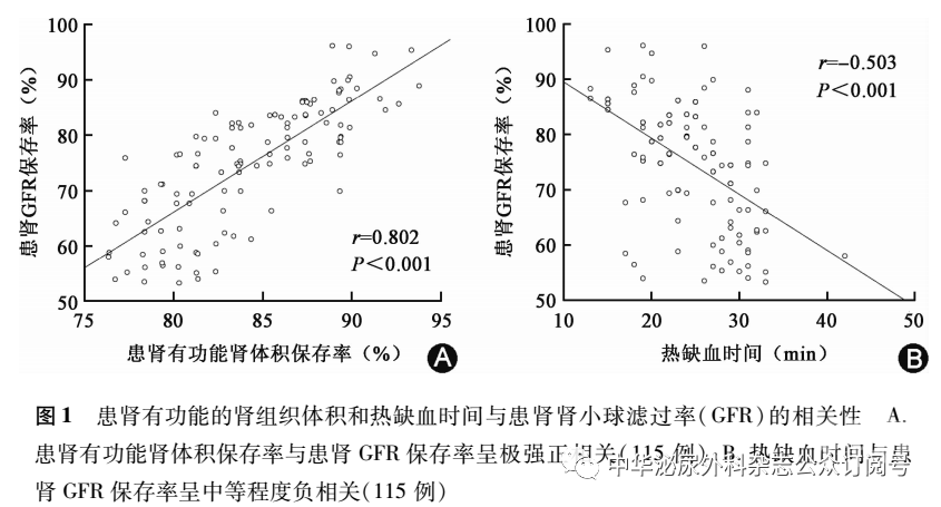 大多数研究通过血肌酐值计算总肾功能(eGFR),不能评估患肾和健肾功能的变化情况,忽视了健侧肾脏的代偿作用,低估了患肾功能损伤程度,无法为缺血损伤的影响提供公正和准确的评估,从而降低了研究结果的真实性。本研究通过99Tcm-DTPA肾核素扫描测定患者手术前后的双肾GFR,结果显示手术前后患肾GFR比较差异有统计学意义(P<0.001);与术前相比,术后6个月健肾肾功能代偿增高。本研究结果显示,患肾FPV保存率与患肾GFR保存率呈极强正相关,WIT与患肾GFR保存率呈中等程度负相关;术前患肾GFR、WIT、患肾FPV保存率是患肾GFR保存率的独立预测因素;术后6个月WIT>25 min组的患肾GFR保存率明显低于≤25 min组。这些结果表明保留肾组织的数量是NSS术后肾功能预后关键的可改变因素,有限的WIT起次要作用,行NSS时在保证完整切除肿瘤的前提下,应注重保留更多的肾组织,同时尽量将WIT控制在25 min以内。