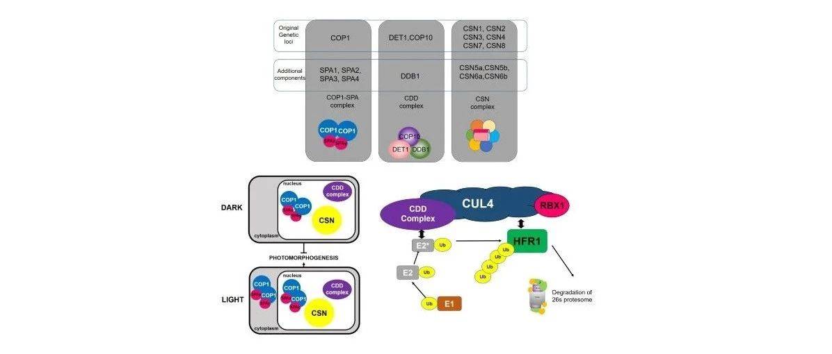 文中作者从三个方面综述了COP1三十年的研究进展。1. COP1本身是一个E3泛素连接酶,并具有保守的生化特征。2. COP1通过与其它调控因子形成各式复合体(COP1/SPA复合体;CUL4复合体;UVR8-COP1/SPA复合体)来调控生物过程。3. 在不同的植物类群中,COP1发挥不同的作用:a. 拟南芥COP1作为光信号调控的“刹车”装置,与光受体共同精细调节幼苗发育;b. COP1参与调控拟南芥幼苗出土过程;c. 小立碗藓COP1参与到重力响应;d. 莱茵衣藻COP1参与到强光保护和紫外光信号调控中。文章从进化的角度,总结提炼了COP1功能的保守性和差异性。本文将为光信号领域感兴趣的读者提供全面易懂的信息。