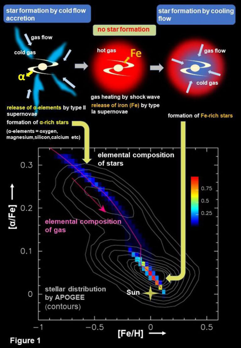 论文作者、UCI物理学院院长、物理与天文学教授James Bullock介绍道:“这些高精确的数值模拟实验结果向我们表明,银河系很可能一直在环星系区域中发射由超新星爆炸引发的输出恒星流。当多个大恒星死亡时,其产生的能量可以将星系中的气体驱逐出去,而气体冷却下来后,又导致了新的恒星诞生。”