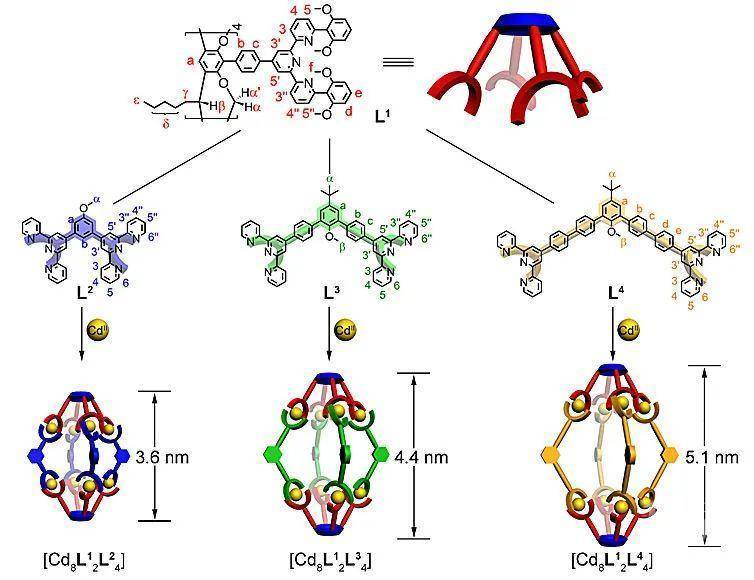 近期,在配位驱动自组装领域,台湾大学詹益慈研究团队发展了一类自识别的三联吡啶配体对,它们能和Cd(II)离子自发络合形成热力学稳定的混配配合物(J. Am. Chem. Soc., 2016, 138, 3651)。在此互补配对系统的基础上,该研究团队成功构筑了放大版三角形、环中环、六芒星等超分子结构(Chem. Eur. J., 2018, 24, 9274; J. Am. Chem. Soc., 2019, 141, 16217)。近日,他们又报导了三种由杯[4]间苯二酚芳烃为主构筑的纳米胶囊,包括二聚体胶囊、Sierpiński三角棱柱和立方星(图1)。其中,Sierpiński三角棱柱是首例利用Sierpiński三角形构筑的3D结构,为以后更高阶Sierpiński 3D结构提供了借鉴;而立方星结构具有非常大的分子量(37 192 Da),但即使如此大的分子,立方星的核磁讯号仍然具有很清楚的裂分。