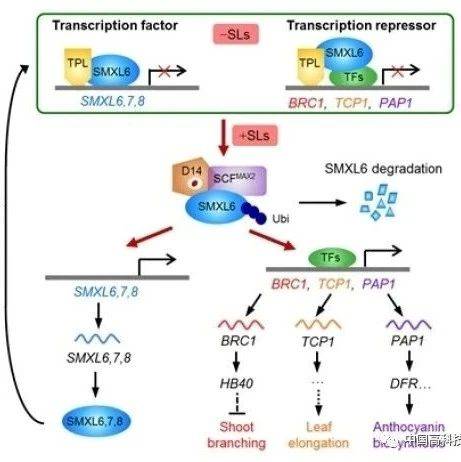 在本研究中,研究人员发现miR156-SPL分子模块的两个重要成员,SPL9和SPL15蛋白,可以直接激活下游分枝关键负调控因子BRC1的转录,从而抑制植株分枝的产生;光敏色素A (phyA) 信号通路中的两个重要信号传导因子FHY3/FAR1和独脚金内酯信号途径重要因子SMXL6/7/8都可以与SPL9/15两个蛋白互作,并抑制SPL9/15对BRC1的转录调控,从而促进植株分枝的产生。此外,研究还发现FHY3和FAR1能直接促进SMXL6和SMXL7的转录。在遮荫或密植栽培条件下,FHY3和FAR1蛋白水平下降,引起SMXL6和SMXL7的转录本和蛋白水平下降,使SPL9/15蛋白被释放出来,导致其下游基因BRC1的转录水平升高,从而抑制了植株分枝的产生。