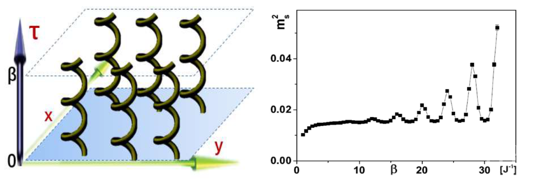 图1. 左边:虚时间晶体在2+1维欧几里得空间中的典型的世界线时空构型。右边:该量子微观构型在宏观测量时展现为“温度晶体” (密度波序参量随温度振荡)。