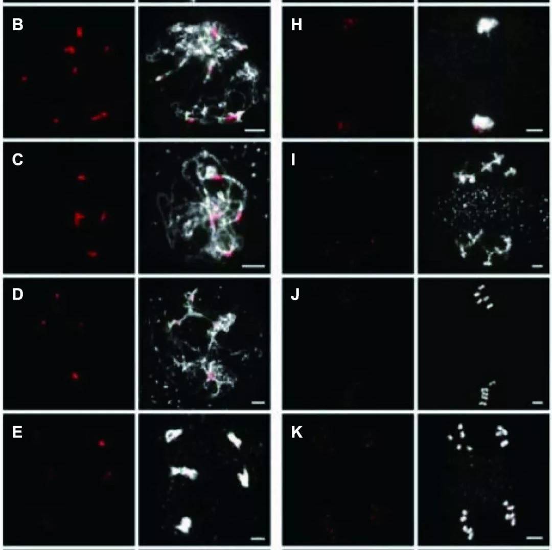 在重组的过程中,染色体会首先招募一些蛋白质因子打断DNA,产生DSB。然后,每对染色体的父本和母本会找到对方,并以未断裂的染色体作为模板修复DSB。在DNA断裂和修之后,来自父母本的染色体会捆绑在一起。事实证明,这种暂时的结合是让细胞知道染色体对的两个成员准备进入不同细胞的关键部分。因此,每一对染色体至少需要一个DSB来确保被正确分离。