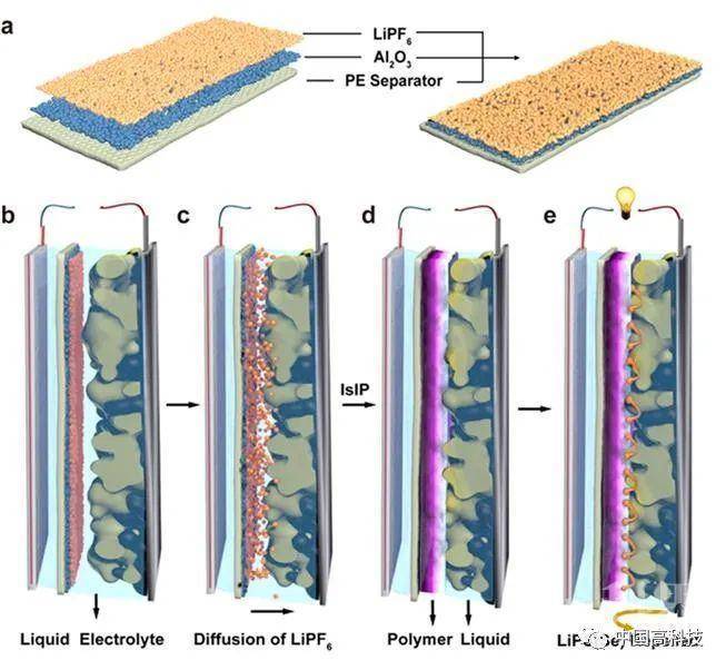 LiPF6-复合隔膜引发锂-硫(硒)电池电解质原位界面固化的原理示意图: (a) LiPF6-复合隔膜的基本构型;(b) LiPF6-复合隔膜在锂-硫(硒)电池中的组装过程;(c)LiPF6-通过扩散作用在正极/电解质界面上的缓释过程;(d)LiPF6诱导电解质原位界面聚合;(e) 界面凝胶电解质对多硫(硒)穿梭的阻挡作用。
