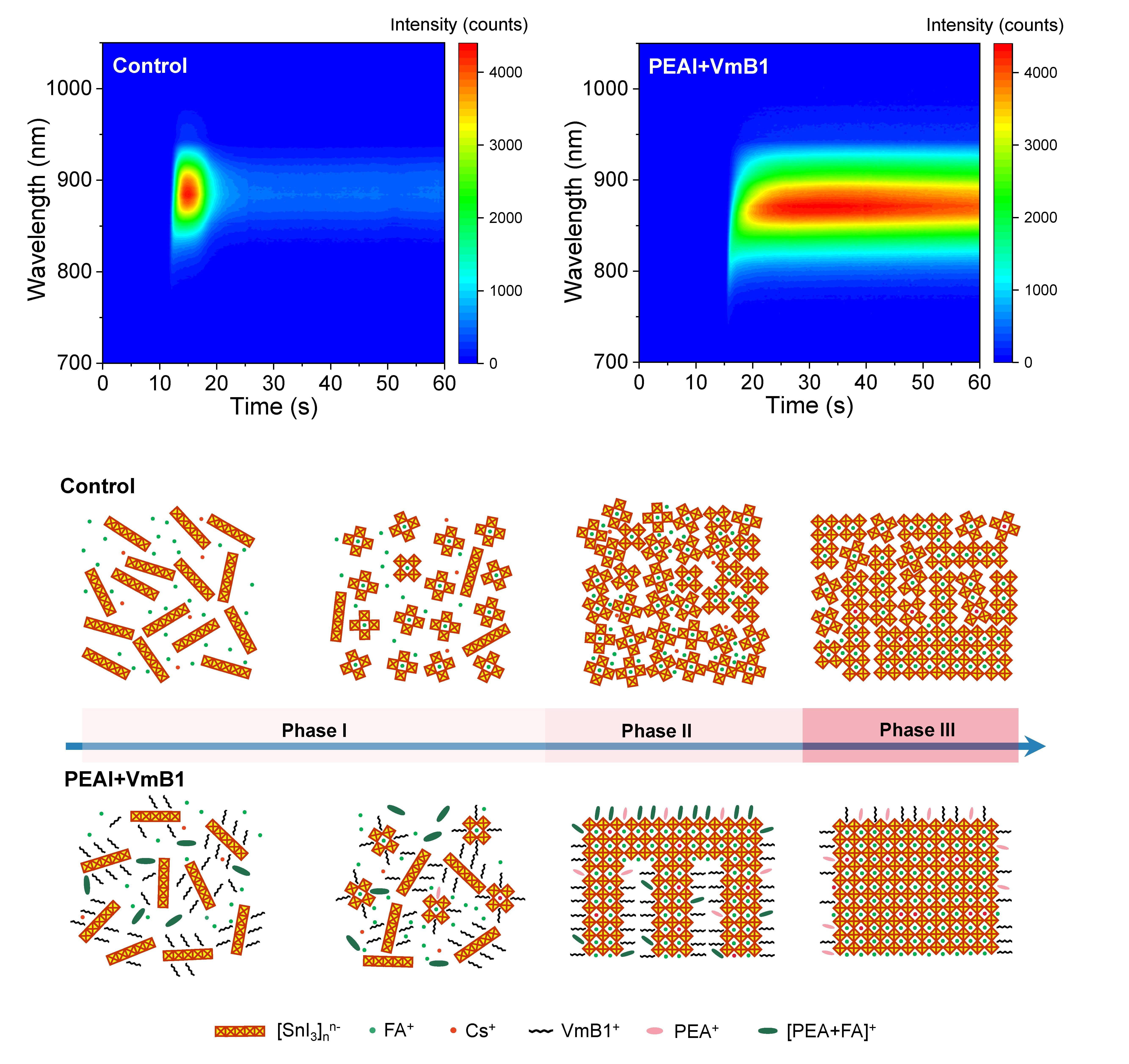 为此,研究人员通过在CsPbI3钙钛矿前驱体溶液中添加适量的对氟苯甲基碘化铵(4-F-PMAI)来调制CsPbI3钙钛矿晶粒的大小,成功获取了晶粒尺寸小于100 nm的多晶薄膜。由于纳米晶具有较高的比表面积,在室温下高对称性的立方晶系结构纳米多晶薄膜反而更稳定。该研究通过调控晶粒尺寸,在室温下获得了稳定存在的α-CsPbI3纳米晶薄膜。同时由于纳米晶的量子限域效应和表面4-F-PMAI配体的钝化作用也提升了α-CsPbI3钙钛矿的辐射复合速率,薄膜展现出强烈的光致发光和较高的量子产率。最终制备的CsPbI3发光二极管在692 nm处发射出明亮的可见红光,光谱半高宽仅为36 nm,外量子效率达14.8%,是未掺杂器件的最高效率值;在恒定电流密度下,器件半衰寿命超过1200min,远高于同条件下的有机无机杂化MAPbI3发光二极管(139min);并且在长期存放过程中效率没有下降,表现出更优异的组分稳定性。此外,研究还显示少量的Br掺杂可将器件效率进一步提升至18.6%,而没有明显的相分离现象。