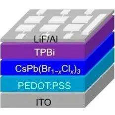 图1. CsPbI3发光二极管的(a)器件结构示意图;(b)能级图;(c)色度坐标和发光照片;(d)电流-电压-亮度曲线;(e)外量子效率-电流曲线;(f)电致发光光谱。
