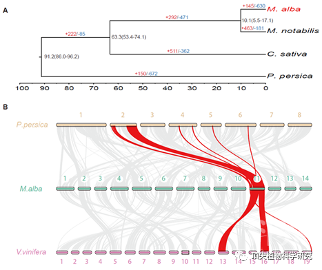 图2 (A)白桑(Morus alba)与川桑(M. notabilis)的分化距离在~10.1个百万年左右,(B)白桑与葡萄(Vitis. vinifera)和桃(Prunus persica)基因组共线性分析。