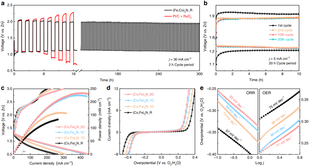 作者在这项工作中,开发了一种具有分级结构的钴、铁复合氮化物,并借此提出了“动态催化剂”这一概念,以描述金属类材料在锌-空气电池中的电化学行为。在锌-空气电池测试的初期,此催化剂表现出了一个较为明显的活化阶段,并伴随着充放电电压区间的逐步减小以及电池功率密度的逐渐提升(图1)。作者将这个现象描述为催化剂的熟化过程,即从初始的氮化物形态逐步成熟为具有电化学响应的活化状态。这一熟化过程带来了活性位点的转变,以及电化学活性面积的增加,从而导致了上述的电池性能提升。这一过程亦会对材料的电化学动力学的参数有影响,比如会引起材料的塔菲尔斜率的明显下降及后续的小幅回升。根据所表现出来的电化学行为,钴、铁复合氮化物在锌-空气电池的运行中,可主要归纳为三个阶段:新相初生成,活性相自调节以及终态成形。