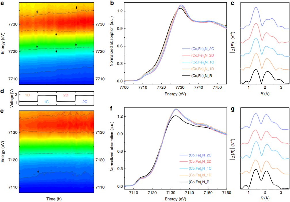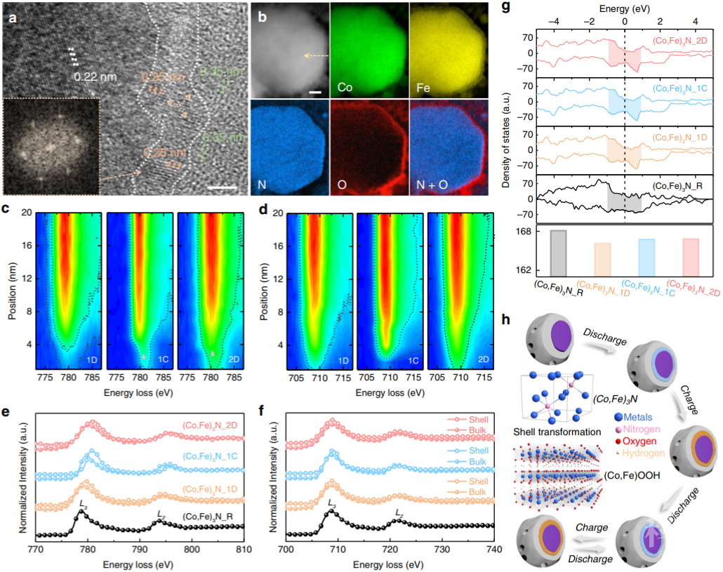 作者通过联用非原位以及原位结构表征技术,验证了钴、铁复合氮化物熟化过程的三个阶段,揭示了所生成的具有“核-壳”差异的构型为氮化物在锌-空气电池运行过程的真实状态(图2,3)。其中,“核”为氮化物本身,而“壳”是具有电化学响应相的钴、铁复合的羟基氧化物。因为羟基氧化物具有远低于金属氮化物的电导率,尽管新相的生成带来了本征活性更高的活性位点,却会使得材料整体电导率的下降,从而惰化催化剂整体的电化学动力学参数。除此之外,钴和铁被证明在锌-空气电池运行过程中具有不同的作用,其中钴被证明是此氮化物的活性位点。这是因为在电池充放电阶段中,钴会随电流响应,分别表现出了四价(充电)或二价(放电)的特征,而铁则相对惰性,始终保持在三价。在电化学响应相内部,钴和铁之间在初期的组分重组,则对应于新相自调节阶段的性能提升。在最终形态成形之后,锌-空气电池的电化学参数趋于稳定。由此可见,锌-空气电池循环过程中,金属类催化剂并不是一成不变的,而是一个动态变化的过程。即时是在电池性能稳定下来之后,电化学响应相中的活性位点也依然随着充放电电流而作周期性的化学性质演变。