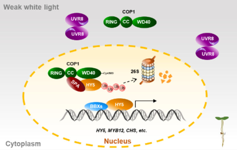 泛素E3连接酶COP1 (CONSTITUTIVELY PHOTOMORPHOGENIC 1) 是主要的光形态建成负调控因子,与SPAs (SUPRESSOR OF phyA-105) 形成复合体,介导HY5 (LONG HYPOCOTYL 5) 等下游光形态建成促进因子降解,抑制光形态建成(photomorphogenesis)。DELLA蛋白N端包含保守的DELLA结构域,是赤霉素(GA)信号通路主要的负调控因子。GA激活的受体蛋白GID1识别DELLA蛋白,招募泛素E3连接酶复合体SCFSLY1/GID2,介导DELLA蛋白降解。
