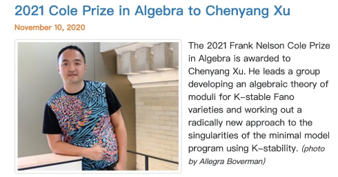 现任职于北京大学数学系的许晨阳,生于1981年,获得今年未来科学科学大奖。他是史上最年轻的获奖者,同时也是首个“数学与计算机科学奖”奖项得主。据悉未来科学大奖奖金为100万美元,奖励许晨阳在代数几何学上作出了极其深刻的贡献,特别是在双有理几何与奇点及其对偶复形的拓扑结构上取得了卓越成绩。