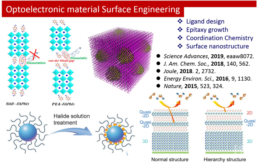 课题组致力于溶液法组装光电材料和器件的研究。研究领域包括材料设计合成到器件应用,通过化学、材料、物理手段相结合来促进光电转换材料化学这一新兴交叉学科的发展。主要研究内容包括:1)光电材料的设计和合成,侧重有机无机杂化材料如胶体纳米晶和钙钛矿材料2) 光电材料的界表面化学研究以及纳米结构精确构筑