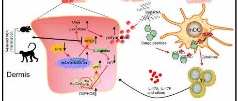 该研究首次揭示,组织特异性细胞的代谢重编程所引起的代谢物异常累积是银屑病等慢性炎症性疾病发生发展的重要“帮凶”,表皮细胞的“多胺+自身核酸+短肽”复合物是激活皮肤免疫反应的“自身抗原”,而靶向调节表皮细胞精氨酸代谢通路的异常有望成为治疗银屑病的全新策略。