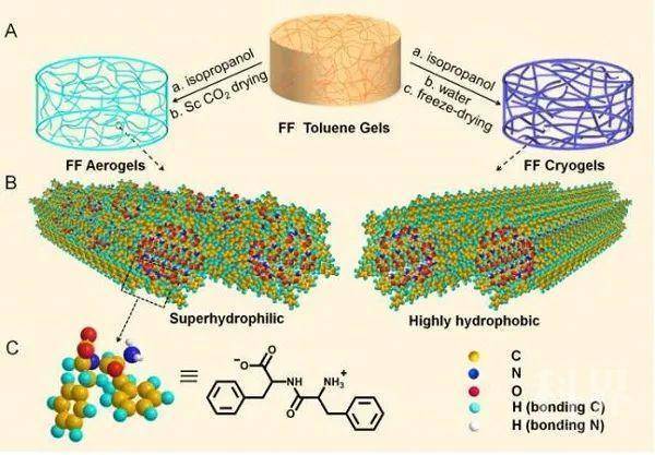 最近,该课题组通过精确控制二肽组装路径,利用溶剂分子诱导二肽分子取向排列,选择性地将其亲水基团或疏水基团暴露在组装的纳米结构外表面,从而形成了具有超亲水或高疏水的宏观表面,实现了组装体表面亲/疏水性的调控,获得了界面浸润性可调控的二肽气凝胶。研究表明,所构筑的二肽组装体的性质(包括荧光发射和比表面积)也具有显著差异。进一步实验证实,上述润湿性可调控的二肽气凝胶在医药领域有其特殊的用途。