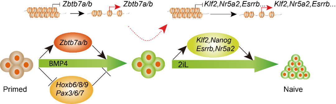 “形象地说,DNA就像一本百科全书,每个细胞都携带着能形成个体的所有信息,但在某个特定阶段,只能翻开这本书里面的一部分。我们的工作就是记录从体细胞到多能干细胞过程中,打开这本书的方式,以及研究是什么‘手’在翻书。”论文第一作者李东伟博士说。他们通过使用ATAC-seq技术去读取染色质“开—关”状态的“二维码”,发现在多能性获得和细胞命运转变过程中染色质结构具备由从开放到关闭(OC)和关闭到开放(CO)间的二元变化规律,且“二维码”在整个干细胞诱导过程中一直在变化。