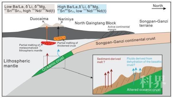 研究人员通过对单斜辉石的微量元素模拟发现,不同岩性内的单斜辉石可以通过玄武质岩浆发生单斜辉石+斜长石±斜方辉石±副矿物的分离结晶获得。此外,在安山岩中存在与玄武岩内单斜辉石成分相似的环带,表明了同源岩浆的充填、混合在不同岩性单斜辉石间普遍存在,并根据单斜辉石与熔体间元素分配系数获得了基性岩中单斜辉石平衡熔体成分。通过对平衡熔体的成分模拟,结果显示源区岩浆受到明显的俯冲沉积组分影响,且俯冲熔体的影响强于俯冲流体。