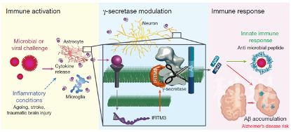 2013年发表在《自然》杂志上的一篇文章指出,阿尔兹海默症患者大脑中激活的分子复合体NLRP3是一种天然的免疫传感器,它在小鼠模型中触发了阿尔兹海默症的发病机理。NLRP3在激活时与配体蛋白ASC会形成大型信号复合物——ASC斑点,并从细胞中释放出来。“目前为止,激活的细胞释放ASC斑点只在巨噬细胞中有记载,它们与疾病过程的相关性仍不清楚。”先天免疫研究所主任Eicke Latz教授说。