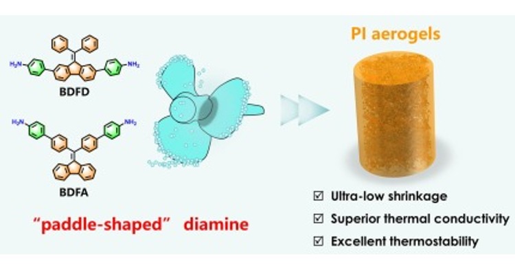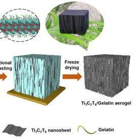 研究人员对聚酰胺酸铵盐/石墨烯的水分散液进行由底部至顶部的定向冷冻,水相遇冷形成冰晶并沿冷冻方向定向生长,聚合物相则于冰晶之外形成孔壁。经过冷冻干燥去除冰晶以后,得到了沿冷冻方向取向排列的孔道结构。最后经热亚胺化,得到了具有定向有序通孔结构的各向异性聚酰亚胺/石墨烯复合气凝胶材料。