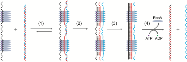 Rad54是Swi2/Snf2家族成员,促进链入侵、催化核小体重塑和从dsDNA中移除Rad51,其缺失导致线虫、小鼠和鸡细胞对DNA损伤的敏感性增加,人的RAD54突变和乳腺癌、结肠癌、淋巴癌和其他癌症相关。现有研究显示Rad54参与同源搜索过程。首先,Rad54中dsDNA依赖性ATP水解酶活性是被Rad51的ssDNA激活的。第二,Rad54可导致dsDNA对ssDNA特异性核酸酶敏感,且这种活性可被Rad51的ssDNA刺激;这两种效应都不依赖于DNA序列同源性,表明Rad54作用发生在同源识别之前。第三,HR的早期阶段与Rad54依赖的染色体迁移率增加相一致,反映同源搜索过程中远距离DNA移动。第四,Rad54促进异源模板和PSC的联合。最后,RAD54缺失扰乱体内的同源搜索【3】。然而,目前缺乏对Rad54在同源搜索中潜在作用机制的研究。