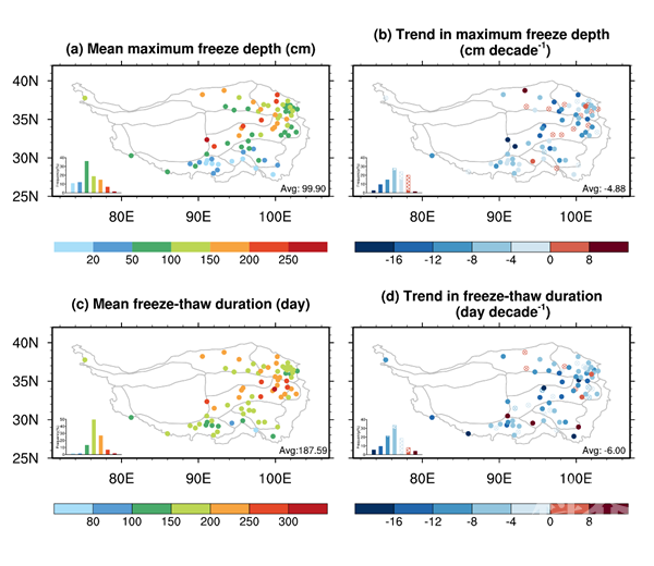 该团队利用地理加权回归模型,综合遥感地表温度、叶面积指数、雪盖比例、多模型土壤水分预报等指标,融合4万多个气象站降水观测及152个气象台站过去50年的年平均气温观测数据,模拟得到了青藏高原过去5个10年1公里年平均气温。并利用多年冻土热条件分类系统,分析了过去50年青藏高原多年冻土的热退化情况。