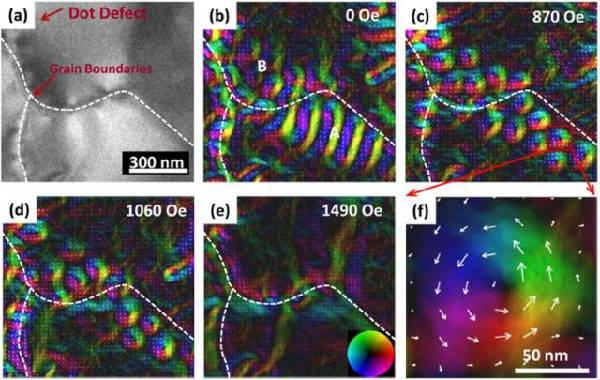 图1: a. Pb(Mg1/3N2/3)O3-PbTiO3单晶与[Pt/Co/Ta]n纳米岛组成的铁电/铁磁多铁异质结器件示意图;b.多铁异质结纳米岛阵列结构;c.异质结横截面结构图;d.不施加外电场时磁畴拓扑状态随纳米岛直径的变化而改变。