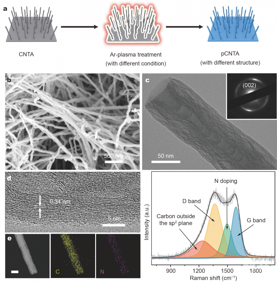 图1 等离子体处理的氮掺杂碳纳米管阵列(Ar-plasma-treated N-doped carbon nanotube arrays,pCNTA)的合成及表征。