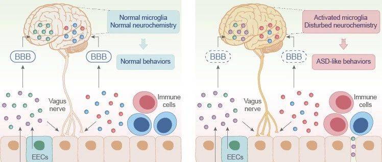 ASD患者肠道菌群组成异常,粪便样本中梭状芽孢杆菌种类增多可以揭示一些患有胃肠功能紊乱的自闭症儿童的胃肠道症状和粘膜免疫反应,特别是因为细菌能够通过可渗透性肠屏障转移。短链脂肪酸,如由拟杆菌产生的乙酸和丙酸盐,以及酪丁酸梭状芽孢杆菌产生的丁酸盐,可以影响紧密连接蛋白与血脑屏障通透性相关,从而可能继发影响脑功能。