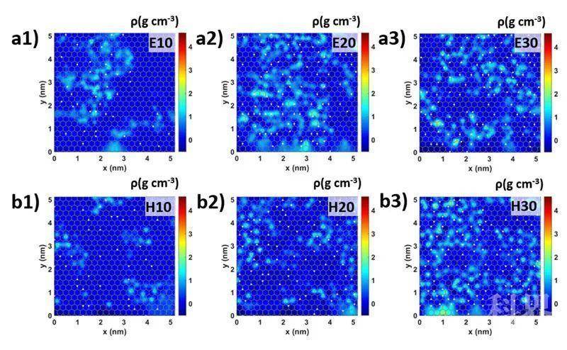 该项研究首先探究了氧化石墨烯与水分子间的相互作用。研究表明氧化石墨烯中的含氧官能团可有效吸附环境中的水分子并形成连续的氢键网络(图1)。总体而言,含氧官能团的质量分数愈高,其所吸附的水分子愈多,且分布更加均匀(图2),形成的氢键网络更加连续。