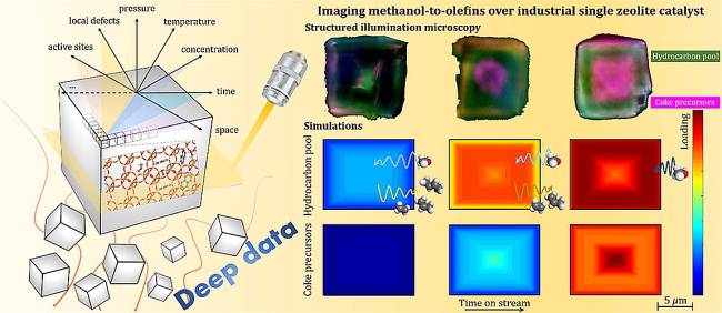 最近,该团队将多尺度反应-扩散模型与超分辨结构照明成像相结合,实现了甲醇制烯烃工业级别SAPO-34分子筛晶体内反应与扩散过程成像,可直接获取反应中反应物和产物分子、积碳物种以及酸性位点的时空分布与演化。研究发现,在甲醇制烯烃过程中,分子筛的晶体粒度可以改变活性中间体(芳烃烃池物种)的空间初始落位,直接决定客体分子与催化剂中酸性位点以及活性中间体的可接触性和利用率,从而对甲醇制烯烃宏观反应性能产生显著影响。该方法还被进一步用于定量描述甲醇制烯烃过程分子筛催化剂快速失活的过程。该研究实现了介尺度模型和时空分辨光谱技术的结合,不仅能够促进理解甲醇制烯烃过程分子筛催化剂反应扩散历程,对分子筛催化剂设计和甲醇制烯烃工艺过程优化具有重要意义,同时为研究非均相催化反应中分子筛晶体中客体分子时空演化行为提供了新思路。