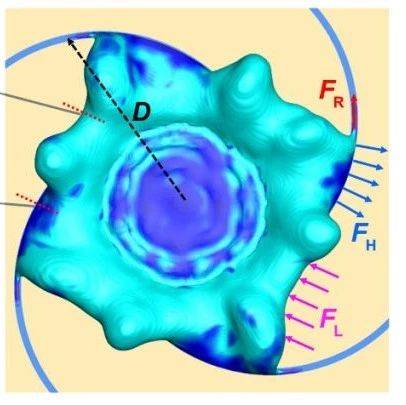 ▲这是一滴离子液体(红色),在水乙醇溶剂(蓝色)中有活动的孔(白色的孔)。这些孔在液滴内部推进。