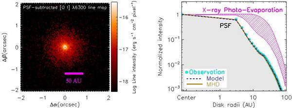 最近,这个小组又重新分析了他们的观测数据,发现在原恒星周围40AU的范围内存在尘埃的热辐射,而13CO和C18O这两种一氧化碳气体分子的辐射比尘埃辐射延伸的范围要大得多,达到了70AU。但是令人惊讶的是,在行星盘的内部,距离中心15AU的范围以内,这两种气体分子的辐射都消失了,在图像上如同出现了一个“空腔”,这与传统理论不符。