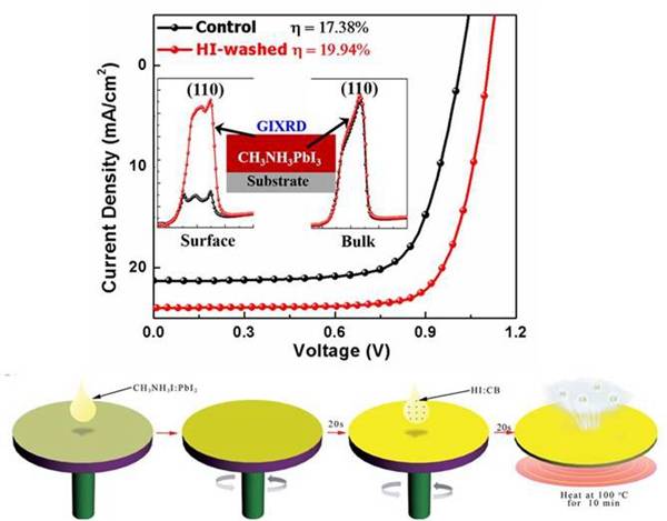 近日,中科院大连化物所薄膜硅太阳电池研究团队刘生忠研究员,和陕西师范大学杨栋研究员、冯江山博士等在柔性钙钛矿太阳能电池研究方面取得新进展。相关结果发表在《先进材料》(Advanced Materials)上。 柔性太阳能电池由于具有质量轻、便携带、易于运输、安装简单等优点备受关注。高性能柔性钙钛矿太阳能电池的关键部分是低温界面层和高质量钙钛矿吸光层。该团队前期通过开发低温界面层,在柔性钙钛矿电池中取得了一系列成果。 研究团队运用二甲硫醚作为添加剂,通过控制钙钛矿吸光层的结晶过程,得到晶粒尺寸较大、结晶性较好、以及缺陷态密度较低的钙钛矿薄膜,将柔性钙钛矿太阳能电池的效率提高到18.40%,同时将大面积(1.2cm2)柔性钙钛矿太阳能电池的效率提升到13.35%。另外,利用添加剂制备的钙钛矿吸光层稳定性得到显著增加,在35%的湿度下放置60天,电池的效率仍能保持86%的原有效率,而无添加剂制备的钙钛矿太阳能电池效率相同条件下仅可保持原有效率的50%。 本项研究成果是目前柔性钙钛矿电池的最高效率,为柔性钙钛矿太阳能电池的发展奠定了实验和理论基础。