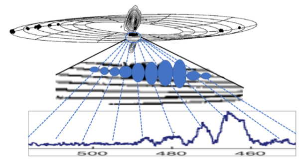 这种质量扭曲的能力使描述超大质量黑洞的特征变得十分棘手。随着星系中心的恒星、气体和尘埃越来越接近超大质量黑洞,它们越来越紧密地进入越来越小的空间,逐渐升温,直到在一个临界距离时,一切都被撕裂,还原成原子等粒子。当我们发现超大质量黑洞时,实际看到的是围绕黑洞并散发热量的碎片——称为“吸积盘”——而不是黑洞本身。