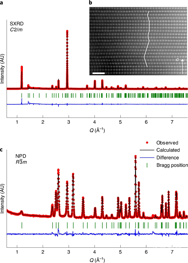 层状氧化物正极材料(LiTMO2,TM为3d过渡金属)是实现300Wh/kg以上高能量密度锂离子电池的关键材料。特别是由岩盐结构单元Li2MnO3与六方层状结构单元LiTMO2形成的富锂锰基层状氧化物正极材料(Li1+xTM1-xO2,或者可以写为xLi2MnO3·(1-x)LiMO2),由于具有两倍于第一代锂离子电池正极材料LiCoO2的可逆储锂容量而倍受关注(达到300 mAh/g)。但是该类材料在电化学循环过程中出现持续的电压衰减(Voltage fade),成为限制其实际应用的主要瓶颈。由于富锂锰基材料具有复杂的结构和化学组成,在电化学过程中发生复杂的电荷补偿并伴随着缓慢的结构变化,对电压衰减的机制一直缺乏准确的认识和确凿的实验证据。
