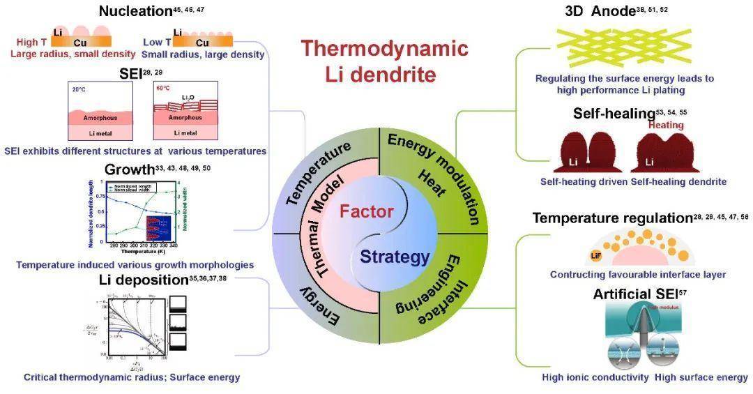 图 6 热力学因素对锂枝晶的影响和策略总结综上所述,本文提供了对锂枝晶形成的研究,通过包括温度和能量因素的热力学参数的考虑来构造无枝晶锂负极的相关问题和解决方案(图 6)。基于热力学参数的未来研究方向应该包括: