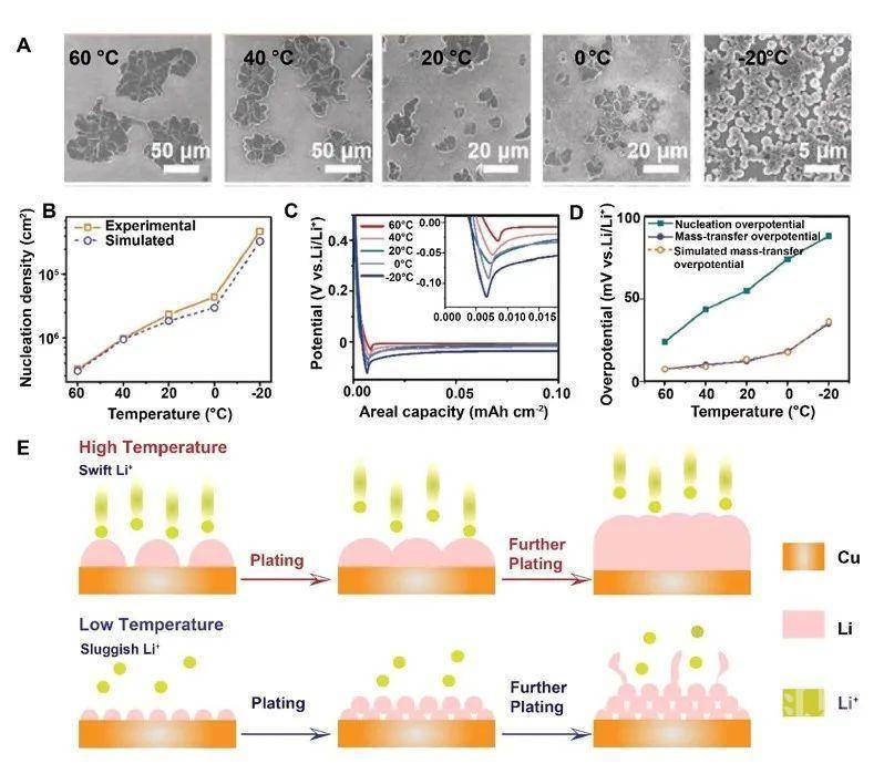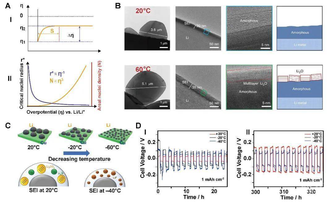 图2 锂枝晶的成核和生长机制以及SEI的温度效应锂的成核过程涉及两个重要参数:弛豫时间S和成核过电势∆η(图2A-I)。根据Arrhenius方程,锂成核速率随温度升高而增加,从而导致弛豫时间减少,表明初始成核过程很可能是在较短的时间内完成的。相反,Li+迁移速率随温度降低而减小,导致过电势显著增加以形成足够离子迁移的电场。成核尺寸与成核过电势成正比,而成核密度与(Δη)3成正比(图 2AⅡ)。根据成核初始阶段理论,较高的温度会导致较低的过电势,从而形成较大的成核半径和较低的成核密度。不同温度下铜基底上的锂形核SEM图像和对应的恒电流充放电曲线以及模型仿真结果同样支持了这一认识(图 3A-D)。较高温度下的较大成核半径和较小成核密度导致形成更均匀且致密的锂沉积层(图 3E),较高温度下的锂离子高迁移率促进了Li+迁移到分散的成核位点,形成大且稀疏的锂核并逐渐融合。经过进一步沉积,最终形成了致密的锂沉积层,从而有效避免枝晶形成。